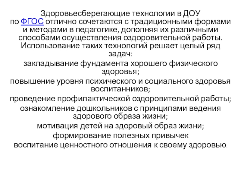 Здоровьесберегающие технологии в ДОУ по ФГОС отлично сочетаются с традиционными формами и методами в педагогике, дополняя их различными способами осуществления оздоровительной работы. Использование таких технологий решает целый ряд задач:  закладывание фундамента хорошего физического здоровья;повышение уровня психического и социального здоровья
