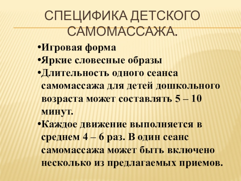 При проведении массажа рекомендуется обучать детей не надавливать силой на указанные точки, а массировать их мягкими движениями пальцев, слегка надавливая или легко поглаживая. Массирующие движения следует выполнять в направлении от периферии к центру (от кистей рук к плечу и т.д.). Приемы самомассажа проводят в такой последовательности: поглаживание, растирание, разминание и вибрация (потряхивание). Продолжительность самомассажа для детей 5-7 минут, в зависимости от поставленной задачи.