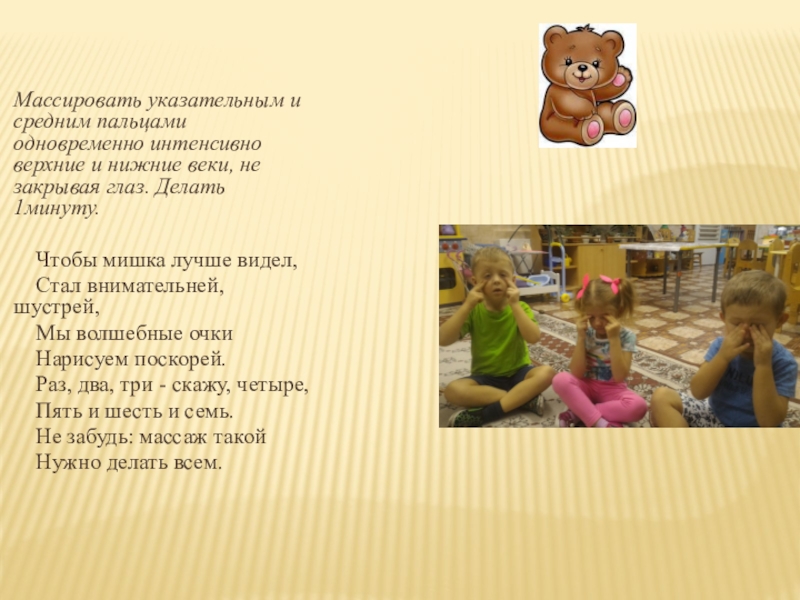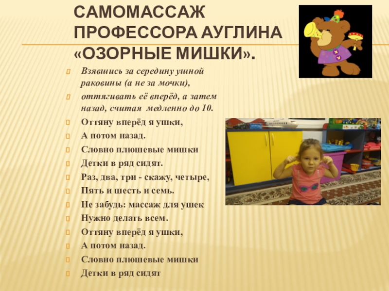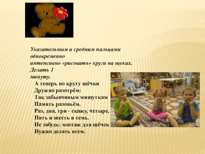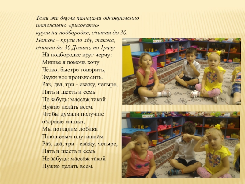 Слайд 7 Обучая детей самомассажу, педагог показывает каждый прием на себе