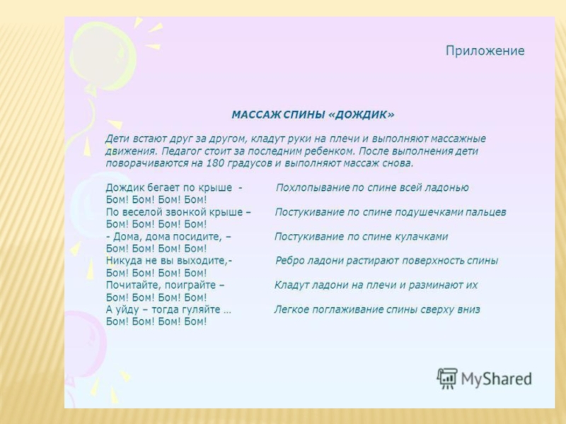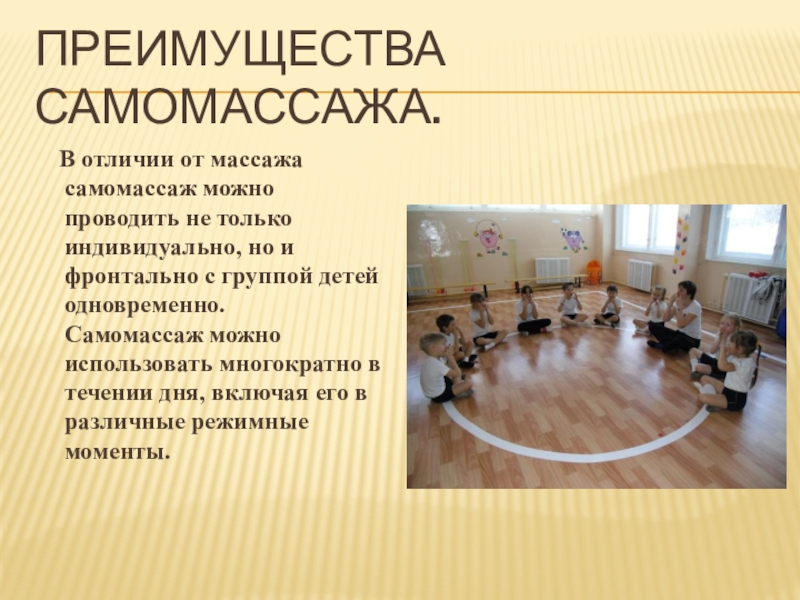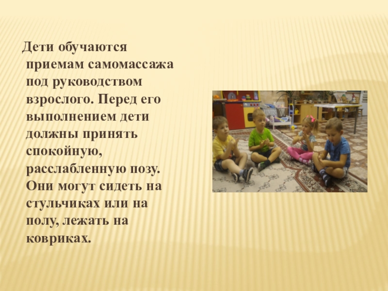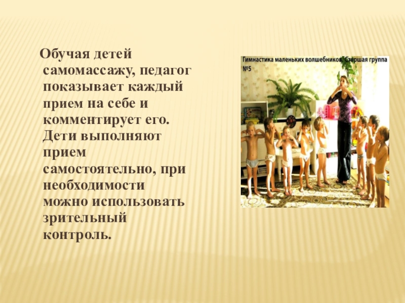 Слайд 6 Дети обучаются приемам самомассажа под руководством взрослого. Перед его