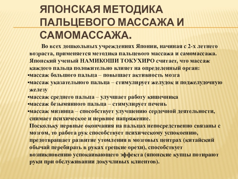 Слайд 9Японская методика пальцевого массажа и самомассажа.
