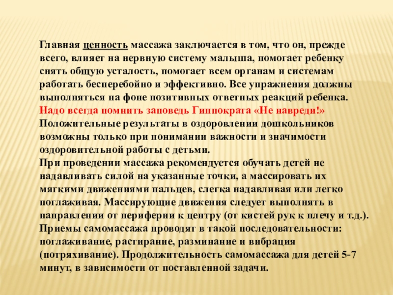 систему малыша, помогает ребенку снять общую усталость, помогает всем органам и системам работать бесперебойно и эффективно. Все упражнения должны выполняться на фоне позитивных ответных реакций ребенка. Надо всегда помнить заповедь Гиппократа «Не навреди!» Положительные результаты в оздоровлении дошкольников возможны только при понимании важности и значимости оздоровительной работы с детьми.