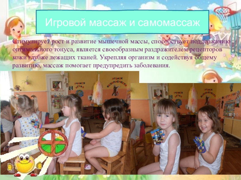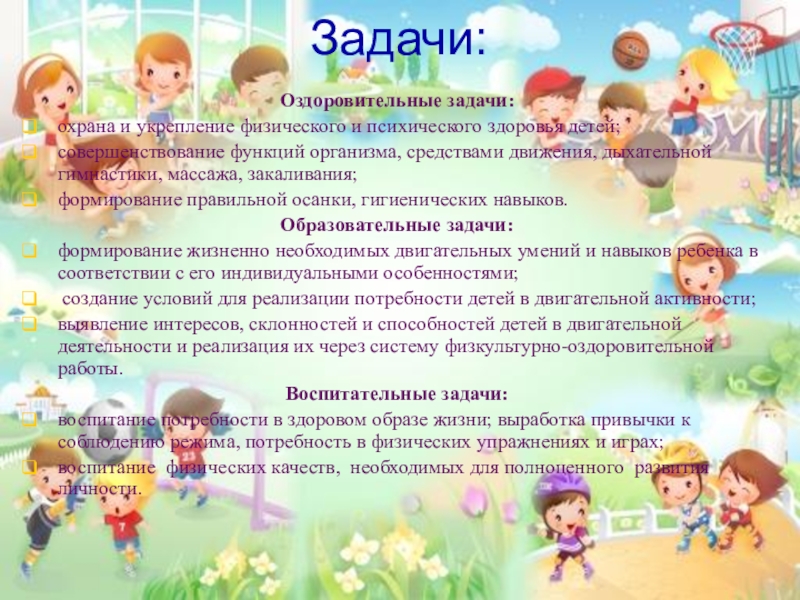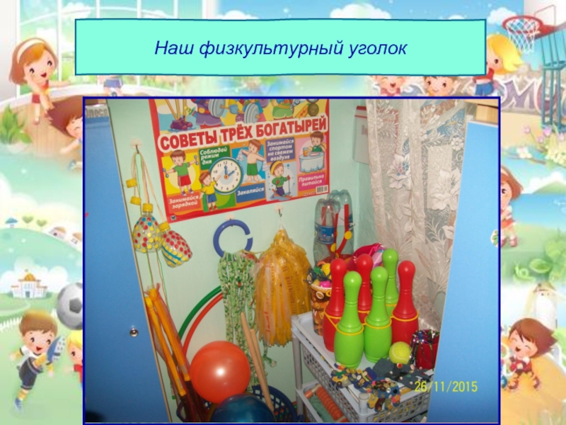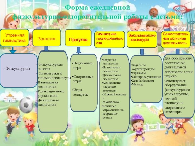 Для обеспечения достаточной двигательной активности детей широко используется оборудование физкультурного уголка группы, детской площадки и спортивного инвентаря.