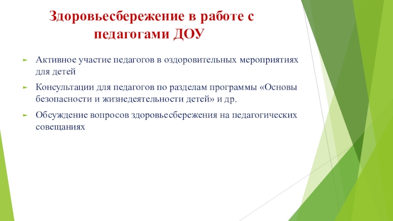 Слайд 20 Здоровьесбережение в работе с педагогами ДОУ