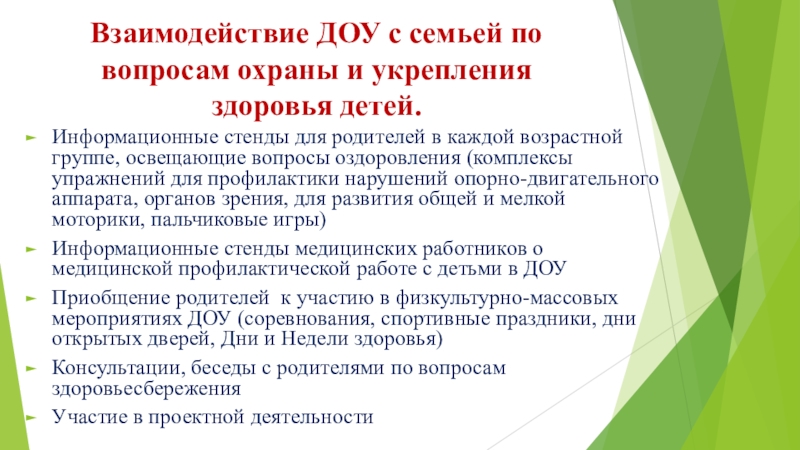 Слайд 22Взаимодействие ДОУ с семьей по вопросам охраны и укрепления здоровья детей.