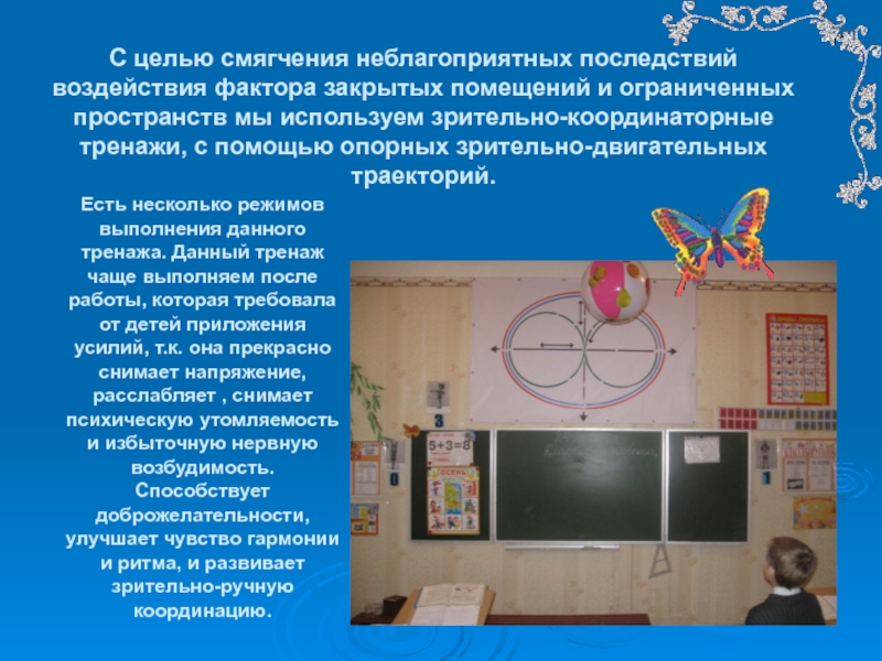 С целью смягчения неблагоприятных последствий воздействия фактора закрытых помещений и ограниченных пространств мы используем зрительно-координаторные тренажи, с помощью опорных зрительно-двигательных траекторий.