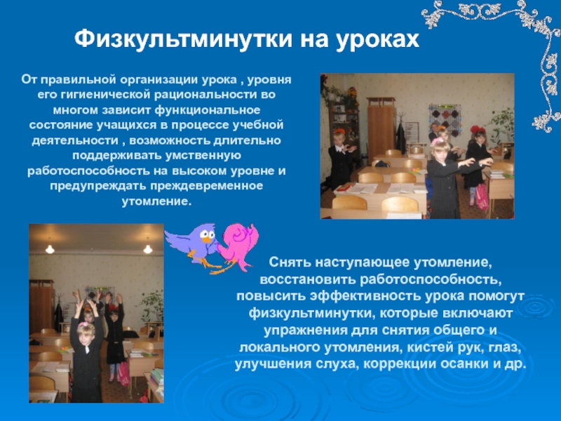 От правильной организации урока , уровня его гигиенической рациональности во многом зависит функциональное состояние учащихся в процессе учебной деятельности , возможность длительно поддерживать умственную работоспособность на высоком уровне и предупреждать преждевременное утомление.