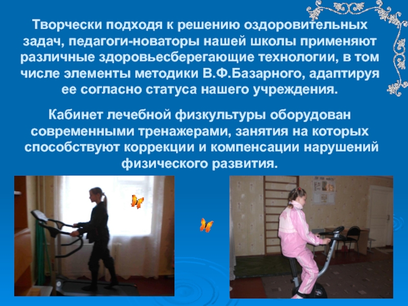 Кабинет лечебной физкультуры оборудован современными тренажерами, занятия на которых способствуют коррекции и компенсации нарушений физического развития.