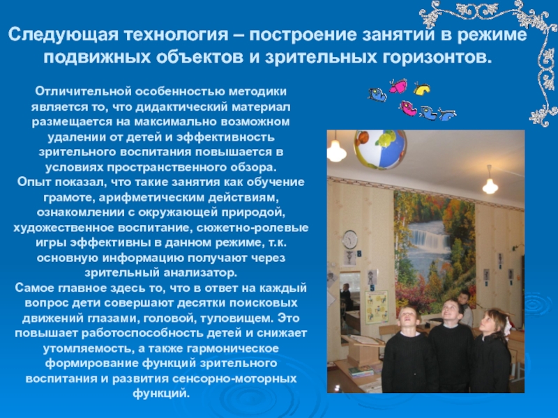Следующая технология – построение занятий в режиме подвижных объектов и зрительных горизонтов.