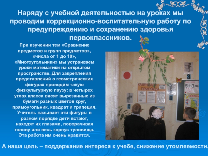 Наряду с учебной деятельностью на уроках мы проводим коррекционно-воспитательную работу по предупреждению и сохранению здоровья первоклассников.