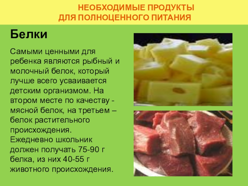 Самыми ценными для ребенка являются рыбный и молочный белок, который лучше всего усваивается детским организмом. На втором месте по качеству - мясной белок, на третьем – белок растительного происхождения.