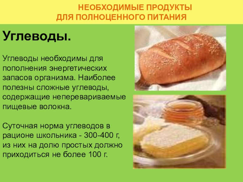 Углеводы необходимы для пополнения энергетических запасов организма. Наиболее полезны сложные углеводы, содержащие неперевариваемые пищевые волокна.