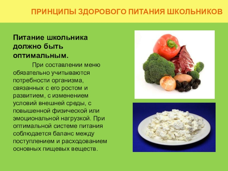 При составлении меню обязательно учитываются потребности организма, связанных с его ростом и развитием, с изменением условий внешней среды, с повышенной физической или эмоциональной нагрузкой. При оптимальной системе питания соблюдается баланс между поступлением и расходованием основных пищевых веществ.