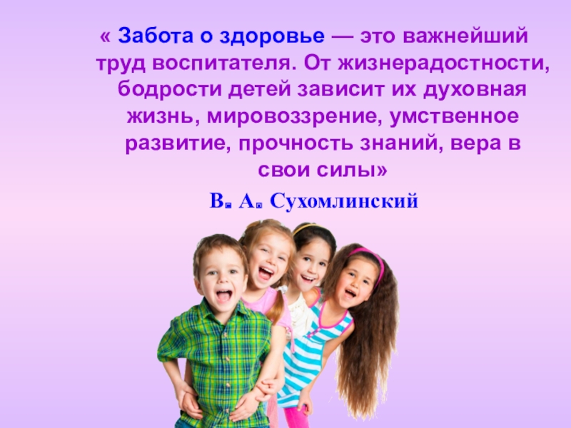 Слайд 2« Забота о здоровье — это важнейший труд воспитателя. От жизнерадостности,