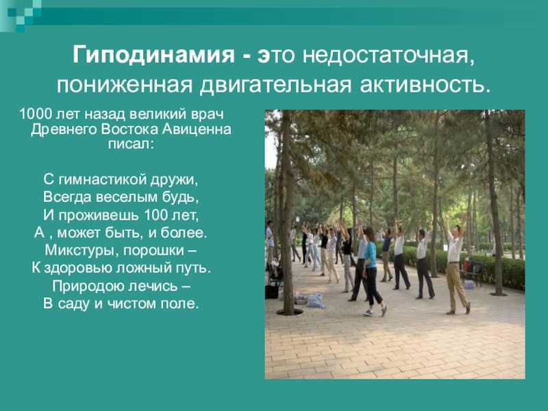 Слайд 9Гиподинамия - это недостаточная, пониженная двигательная активность.