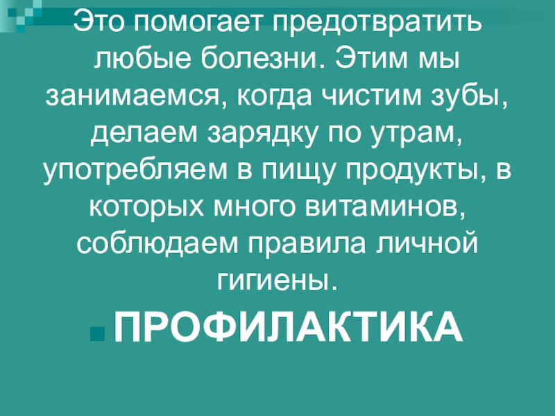 Слайд 57Это помогает предотвратить любые болезни. Этим мы занимаемся, когда чистим зубы,