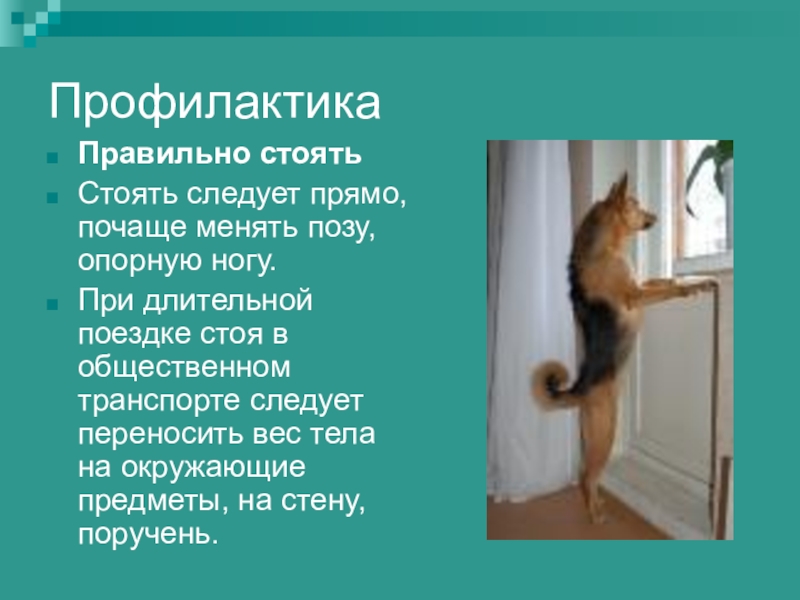 Стоять следует прямо, почаще менять позу, опорную ногу.