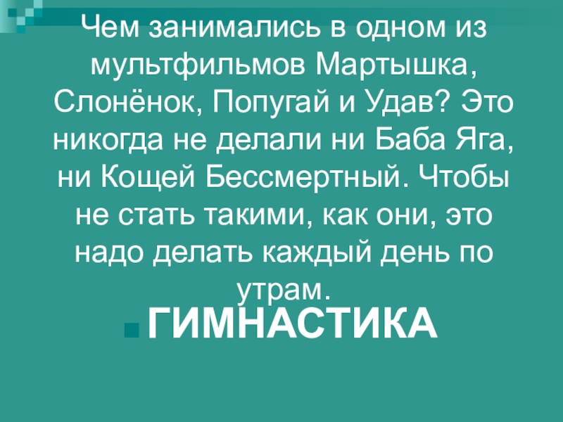 Это никогда не делали ни Баба Яга, ни Кощей Бессмертный. Чтобы не стать такими, как они, это надо делать каждый день по утрам.