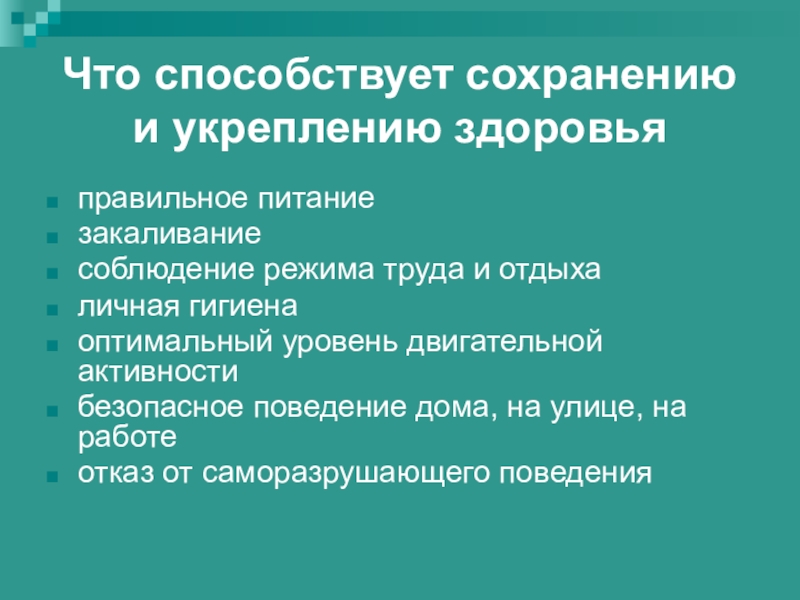 Слайд 7Что способствует сохранению и укреплению здоровья
