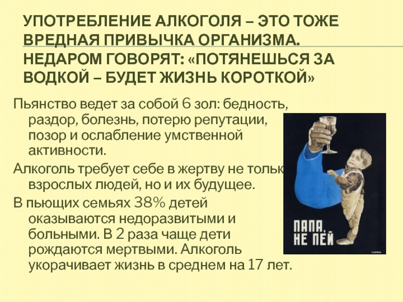 Слайд 19Употребление алкоголя – это тоже вредная привычка организма. Недаром говорят: «Потянешься