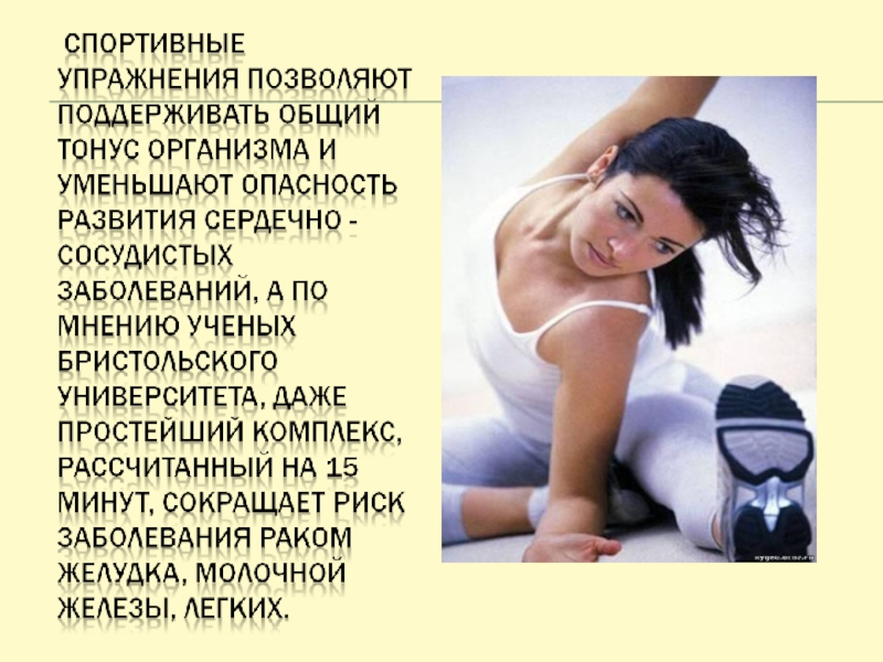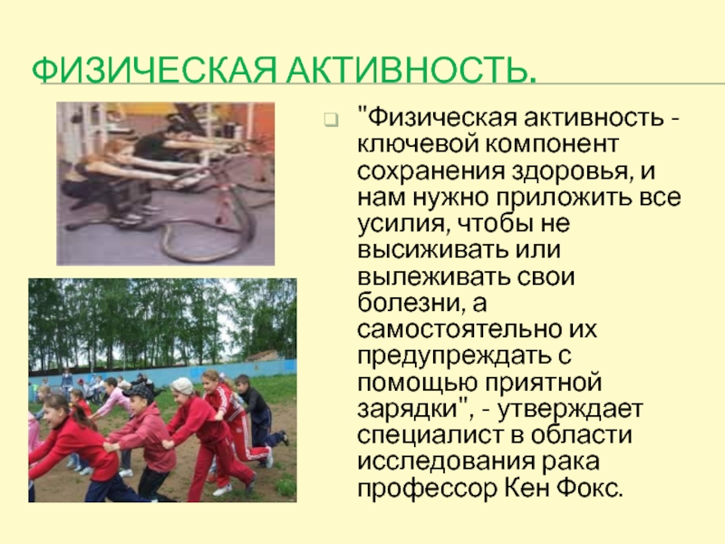 приложить все усилия, чтобы не высиживать или вылеживать свои болезни, а самостоятельно их предупреждать с помощью приятной зарядки", - утверждает специалист в области исследования рака профессор Кен Фокс.