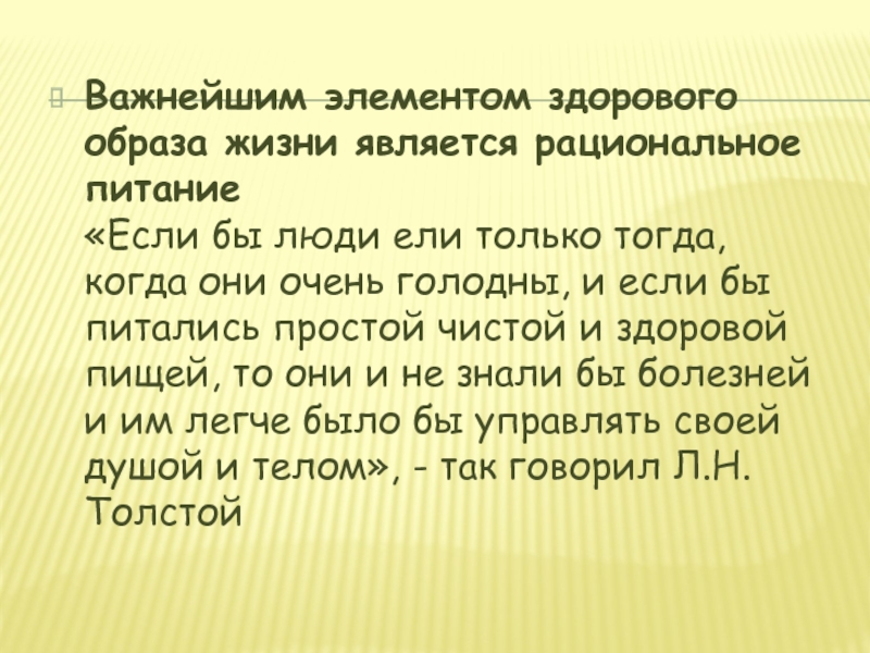 только тогда, когда они очень голодны, и если бы питались простой чистой и здоровой пищей, то они и не знали бы болезней и им легче было бы управлять своей душой и телом», - так говорил Л.Н. Толстой