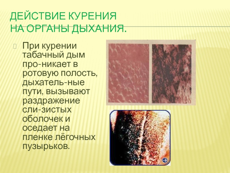 полость, дыхатель-ные пути, вызывают раздражение сли-зистых оболочек и оседает на пленке лёгочных пузырьков.