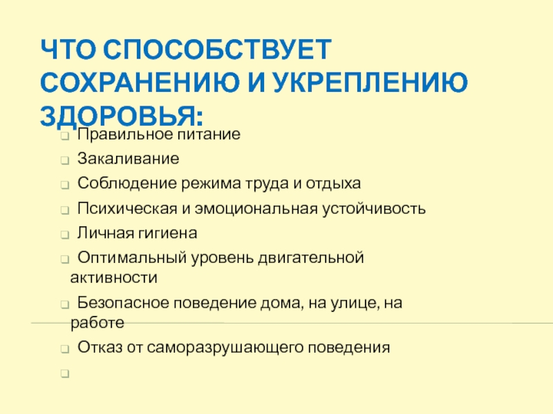 Слайд 3Что способствует сохранению и укреплению здоровья: