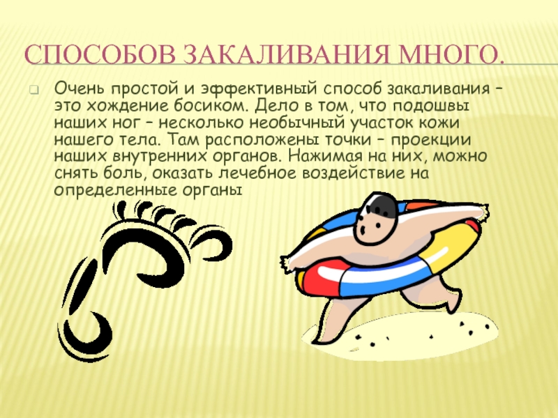 босиком. Дело в том, что подошвы наших ног – несколько необычный участок кожи нашего тела. Там расположены точки – проекции наших внутренних органов. Нажимая на них, можно снять боль, оказать лечебное воздействие на определенные органы
