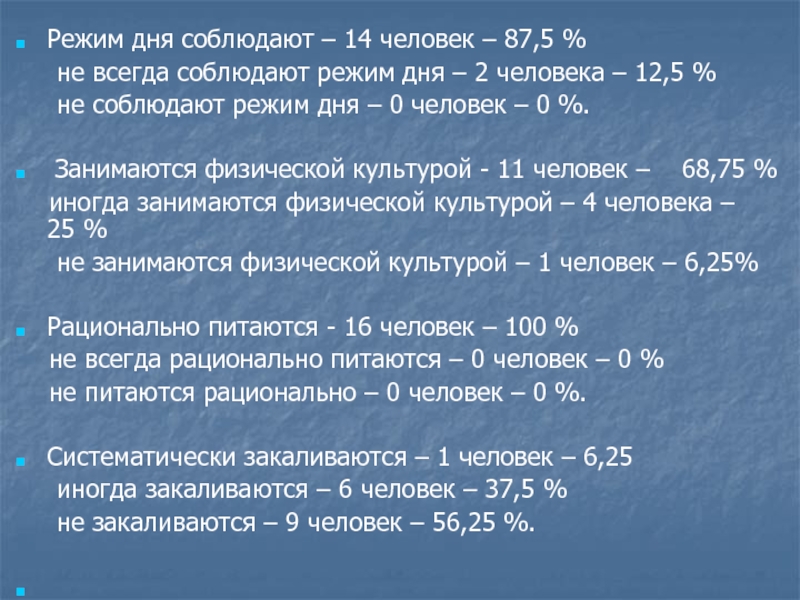 Слайд 30Режим дня соблюдают – 14 человек – 87,5 %