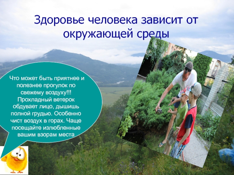 полезнее прогулок по свежему воздуху!!! Прохладный ветерок обдувает лицо, дышишь полной грудью. Особенно чист воздух в горах. Чаще посещайте излюбленные вашим взорам места