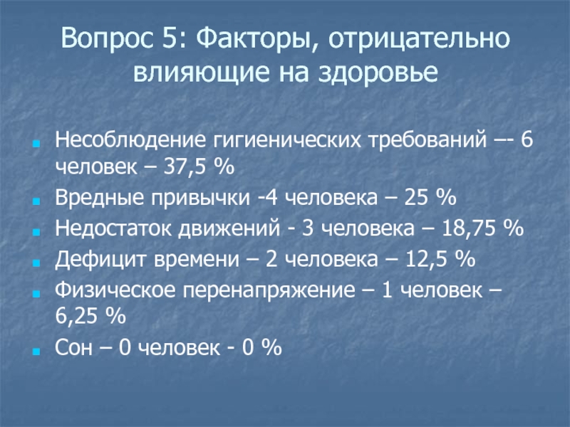 Слайд 27Вопрос 5: Факторы, отрицательно влияющие на здоровье