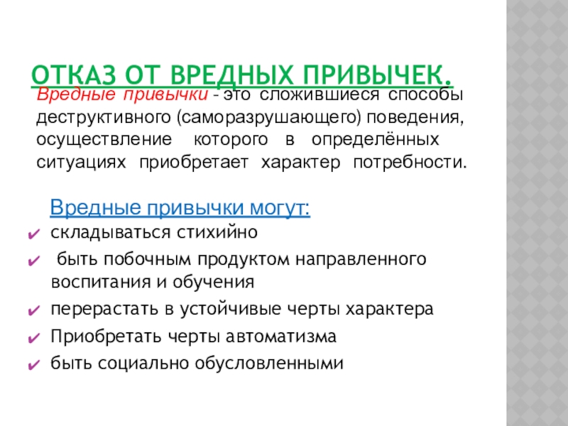 Вредные привычки - это сложившиеся способы деструктивного (саморазрушающего) поведения, осуществление которого в определённых ситуациях приобретает характер потребности.