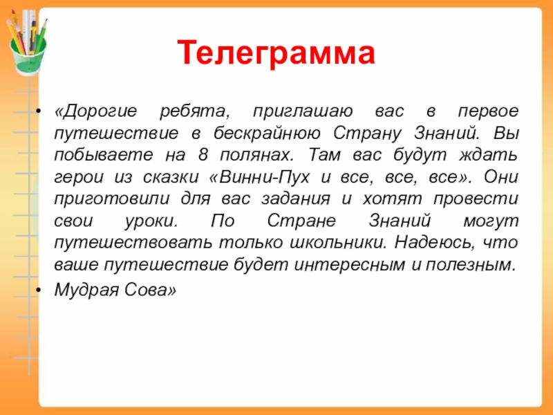 Телеграмма«Дорогие ребята, приглашаю вас в первое путешествие в бескрайнюю Страну Знаний. Вы побываете на 8 полянах. Там вас будут ждать герои из сказки «Винни-Пух и все, все, все». Они приготовили для вас задания и хотят провести