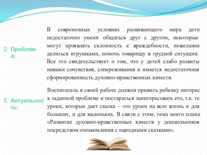 Воспитатель в своей работе должен привить ребенку интерес к заданной проблеме и постараться заинтересовать его, т.к. те уроки, которые дает сказка – это уроки на всю жизнь и для больших, и для маленьких. В связи с этим, тема моего плана «Развитие духовно-нравственных качеств у дошкольников посредством ознакомления с народными сказками».