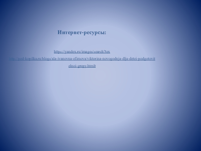 Интернет-ресурсы:https://yandex.ru/images/search?texhttp://ped-kopilka.ru/blogs/ala-ivanovna-efimova/viktorina-novogodnja-dlja-detei-podgotovitelnoi-grupy.htmlt