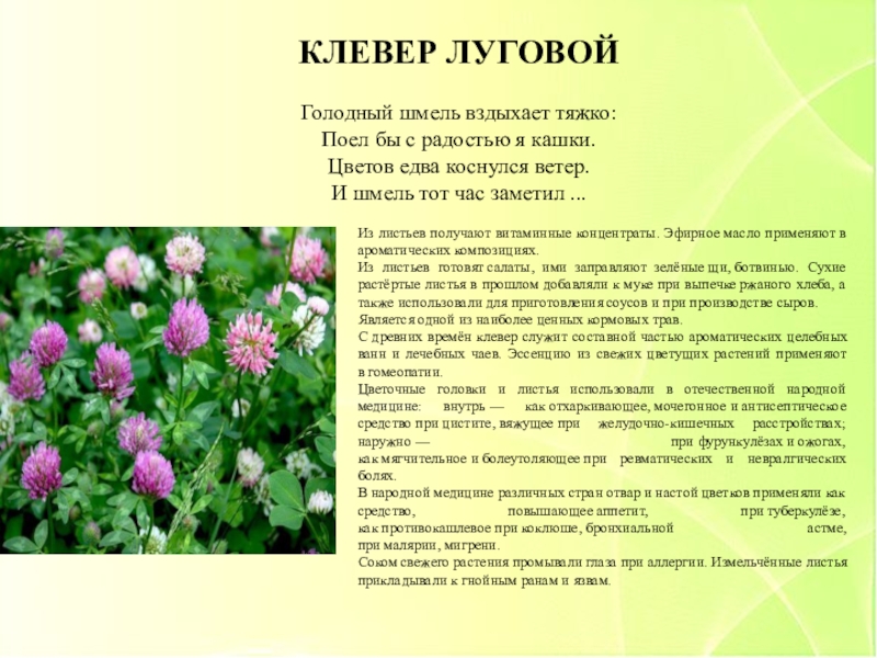 С древних времён клевер служит составной частью ароматических целебных ванн и лечебных чаев. Эссенцию из свежих цветущих растений применяют в гомеопатии.