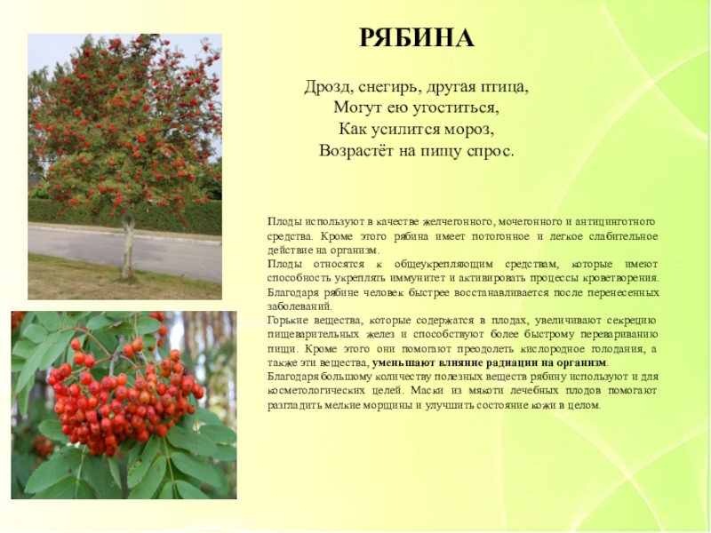 Плоды используют в качестве желчегонного, мочегонного и антицинготного средства. Кроме этого рябина имеет потогонное и легкое слабительное действие на организм.