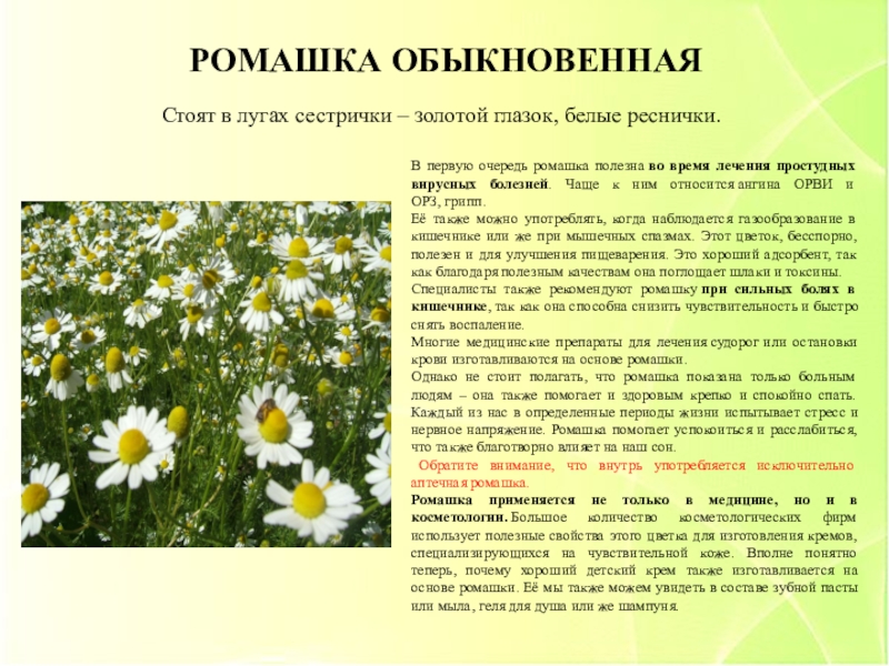 Эта целебная трава хорошо зарекомендовал себя в индустрии красоты. Она обладает противовоспалительным, тонизирующим, антивозрастным и антисеборейным эффектом.