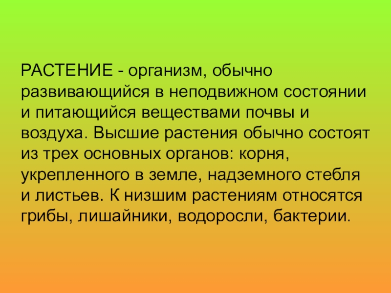 Слайд 2РАСТЕНИЕ - организм, обычно развивающийся в неподвижном состоянии и питающийся веществами