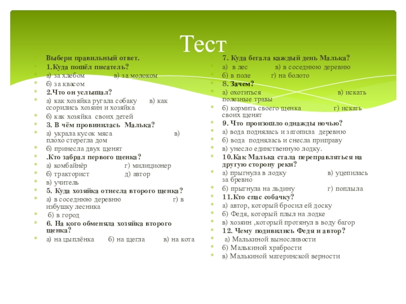 7. Куда бегала каждый день Малька?