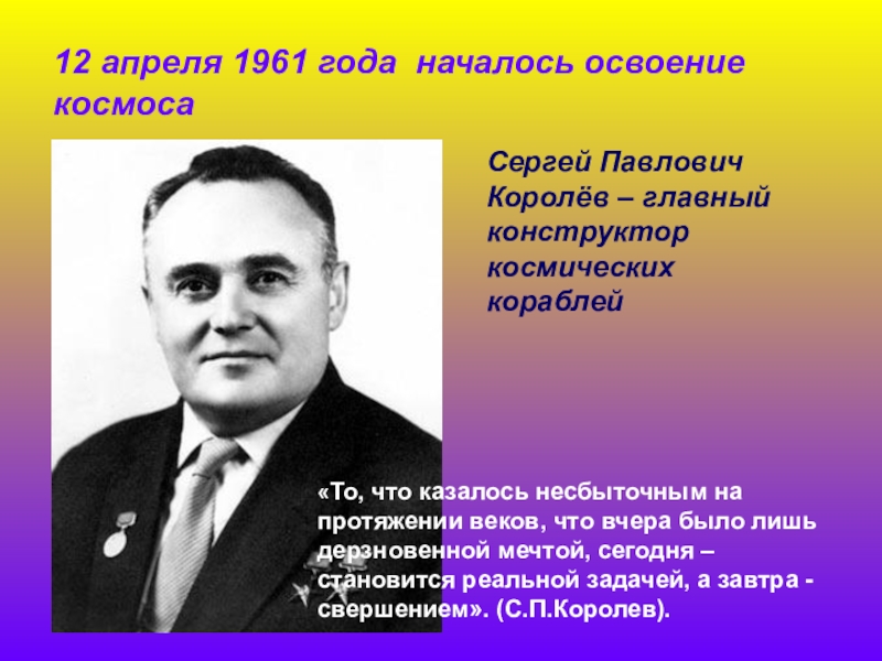 «То, что казалось несбыточным на протяжении веков, что вчера было лишь дерзновенной мечтой, сегодня – становится реальной задачей, а завтра - свершением». (С.П.Королев).