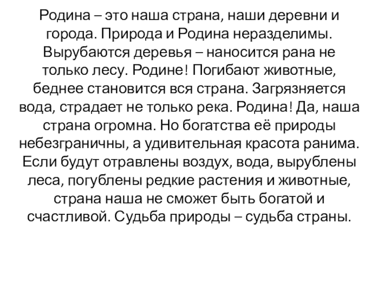 Родина неразделимы. Вырубаются деревья – наносится рана не только лесу. Родине! Погибают животные, беднее становится вся страна. Загрязняется вода, страдает не только река. Родина! Да, наша страна огромна. Но богатства её природы небезграничны, а удивительная красота ранима. Если будут отравлены воздух, вода, вырублены леса, погублены редкие растения и животные, страна наша не сможет быть богатой и счастливой. Судьба природы – судьба страны.