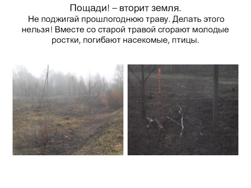 Слайд 5Пощади! – вторит земля. Не поджигай прошлогоднюю траву. Делать этого нельзя!