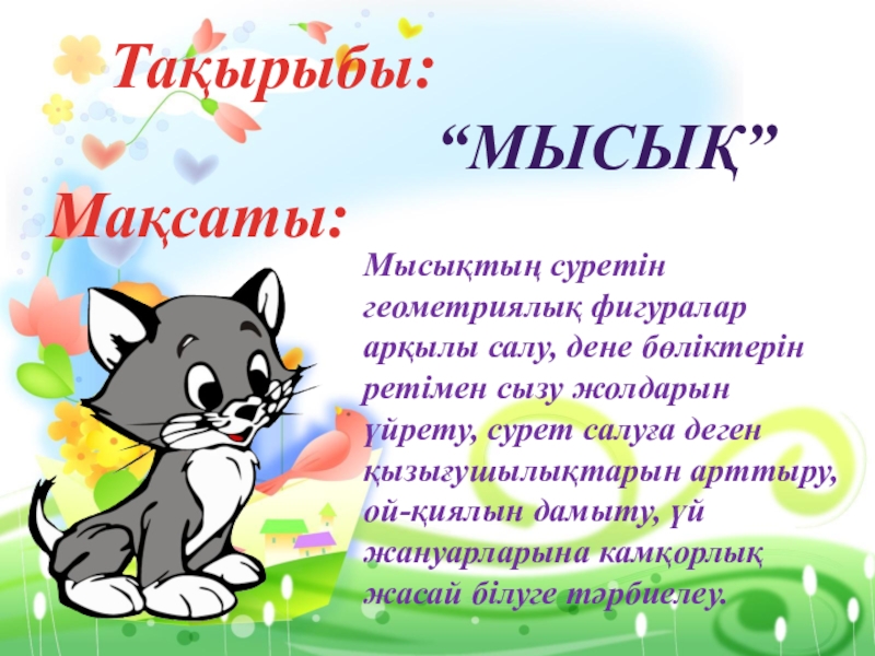 Тақырыбы:“Мысық”Мақсаты:Мысықтың суретін геометриялық фигуралар арқылы салу, дене бөліктерін ретімен сызу жолдарын үйрету, сурет салуға деген қызығушылықтарын