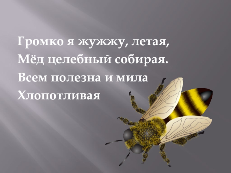 Громко я жужжу, летая,Мёд целебный собирая.Всем полезна и милаХлопотливая