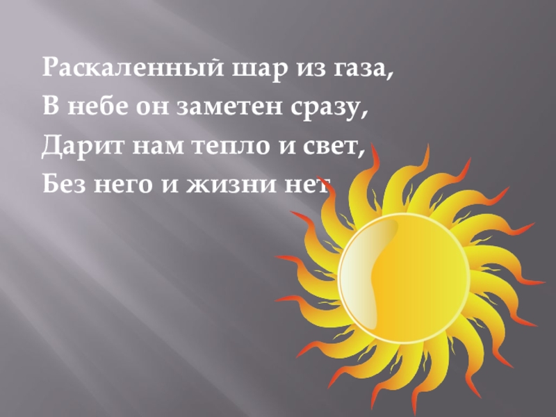 Раскаленный шар из газа,В небе он заметен сразу,Дарит нам тепло и свет,Без него и жизни нет