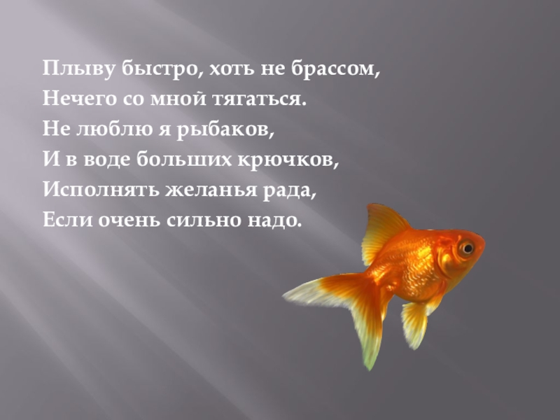 Плыву быстро, хоть не брассом,Нечего со мной тягаться.Не люблю я рыбаков,И в воде больших крючков,Исполнять желанья рада,Если