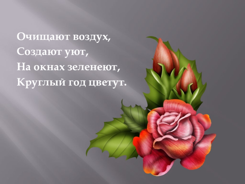 Очищают воздух,Создают уют,На окнах зеленеют,Круглый год цветут.