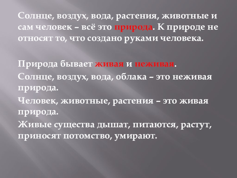 Солнце, воздух, вода, растения, животные и сам человек – всё это природа. К природе не относят то,